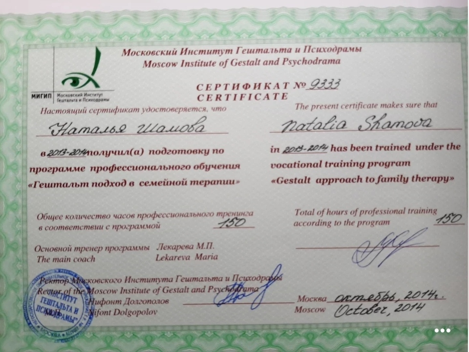 2013-2014 Московский институт гештальта и психодрамы. Гештальт подход в семейной терапии.