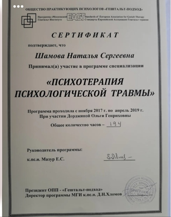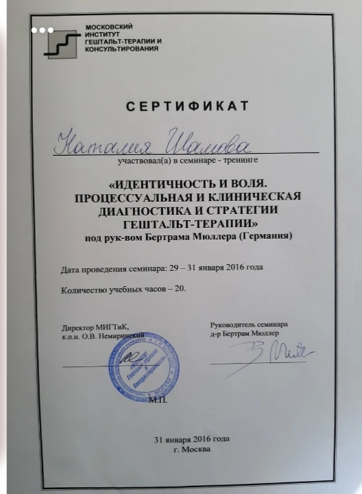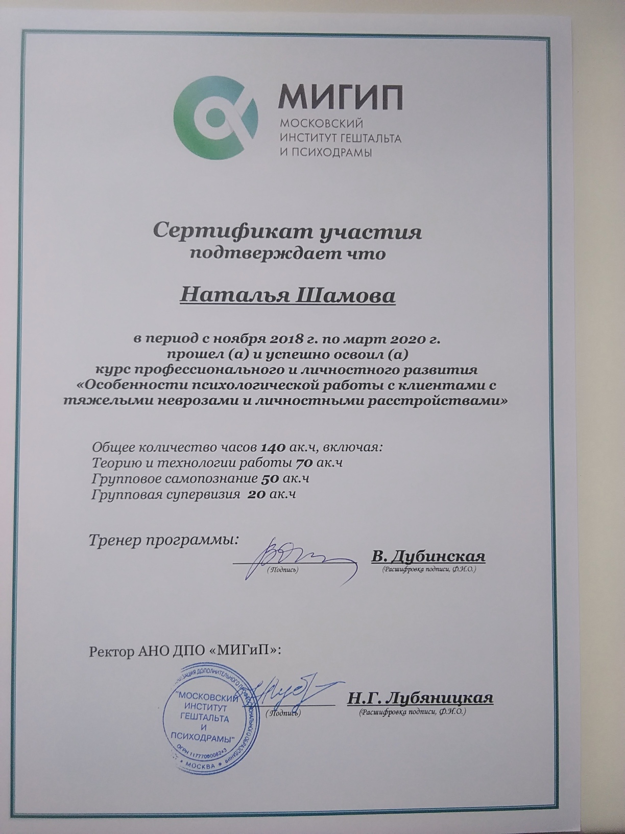 2018-2020 Московский институт гештальта и психодрамы. Особенности психологической работы с клиентами с тяжелыми неврозами и личностными расстройствами.